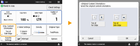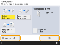 L'état du réglage, tel que le taux de reproduction, le papier de reproduction et le nombre de copies, s'affiche. Lorsque vous souhaitez modifier un réglage, sélectionnez l'élément de réglage souhaité.
