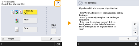 De plus, les touches comme <Annuler>, qui annulent le paramètre puis rétablissent l'écran précédent ; <Suivant>, qui appliquent le paramètre puis affichent l'écran suivant ; <Précédent>, qui rétablissent l'écran de paramétrage précédent ; et <Fermer>, qui ferme l'écran ouvert, s'affichent.