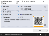 Lorsqu'un code QR est affiché sur une fenêtre Détails d'un journal des erreurs, le balayage du code QR avec un appareil mobile tel qu'un smartphone ou une tablette vous permet d'accéder à une page du Guide de l'utilisateur de cette machine, qui vous indique comment gérer l'erreur.