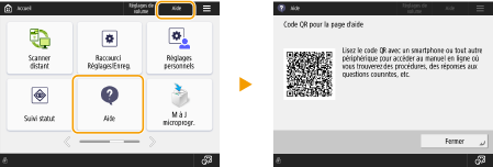 En appuyant sur <Aide>, un code QR s'affiche. En scannant ce code QR avec un dispositif mobile tel qu'un smartphone ou une tablette, vous pouvez accéder à la page Guide de l'utilisateur de cette machine.