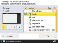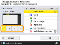 Vous pouvez créer des boutons de raccourci pour les fonctions sur l'écran <Accueil>. Utilisez ces boutons pour accéder aux fonctions sans repasser par l'écran <Accueil>. Pour créer un raccourci, vous devez être connecté avec des privilèges d'administrateur.