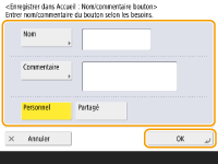 Pour enregistrer un bouton personnel, vous devez vous connecter avec la gestion de l'authentification personnelle. Configuration des réglages de la gestion de l'authentification personnelle Si vous sélectionnez <Infos authentif. connexion périphérique> pour <Infos utilisées pour TX/navigation fichier>, un mot de passe pour une destination de fichier n'est pas mémoriser dans un bouton personnel. <Infos utilisées pour TX/navigation fichier> Pour en savoir plus sur le nombre maximal de boutons personnels et de boutons partagés enregistrables, consultez la section Fonctions de gestion. Il n'est pas possible de transformer des boutons personnels en boutons partagés, et inversement. Pour ce faire, rappelez les réglages et enregistrez un autre bouton depuis .Maintenez un bouton enfoncé pour modifier son nom/commentaire ou le déplacer/supprimer. Les mêmes opérations (changement de nom/commentaire d'un bouton ou déplacement/suppression d'un bouton) peuvent être effectuées à partir de sur l'écran <Accueil>. Personnalisation de l'écran <Accueil>Les boutons personnels peuvent être partagés entre plusieurs appareils en synchronisant les données personnalisées. Liste des éléments personnalisables Réglages enregistrables dans des boutons personnels/boutons partagésLes fonctions et les réglages qui peuvent être enregistrés sur les boutons personnels/boutons partagés sont indiqués ci-dessous. Réglages pouvant être enregistrés dans <Réglages favoris> pour la fonction <Copie> Réduction des opérations de copie Réglages de la fonction <Fax> de l'appareil Opérations de base pour envoyer des fax Réglages pouvant être enregistrés dans <Réglages favoris> pour la fonction <Lire et Envoyer> Fonctions de numérisation utiles Réglages pouvant être enregistrés dans <Réglages favoris> pour la fonction <Lire et mémoriser> Définition de l'écran et des opérations pour une numérisation afin de sauvegarder Les emplacements d'enregistrement pour les fonctions <Lire et mémoriser> et <Accès aux fichiers enregistrés> Utilisation de l'espace de stockage Raccourcis pour l'écran des fonctions de base pour la fonction <Boîte Fax/I-Fax> L'accès à un serveur et le mot de passe de connexion peuvent être enregistrés sur des boutons personnels/boutons partagés. Cette possibilité est pratique pour éviter la saisie du mot de passe en cas de rappel du bouton enregistré. Pour définir un mot de passe dans les réglages mémorisés dans le bouton enregistré, lorsque vous importez souvent des réglages dans un bouton personnel ou un bouton partagé vers un autre appareil et voulez éviter que des utilisateurs ne se fassent passer pour d'autres utilisateurs, excluez un mot de passe lors de l'enregistrement. Importer/exporter les boutons enregistrésVous pouvez importer et exporter les boutons partagés/personnels enregistrés à partir de l'interface utilisateur distante. Import/Export de tous les réglages L'importation par lots des boutons personnels/boutons partagés peut ne pas être disponible, en fonction du modèle de la machine à partir de laquelle l’importation se fait. Pour plus d'informations, contactez votre revendeur ou votre représentant de service. |