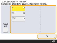 Lorsque l'écran de sélection du format de l'original s'afficheSi l'option <Choisir papier> est réglée sur <Auto>, il peut arriver que l'écran servant à sélectionner le format de l'original s'affiche. Cet écran s'affiche parce que le format de l'original ne peut être vérifié et le papier automatiquement sélectionné lors de l'installation de documents très transparents, des originaux avec des couleurs de base extrêmement sombres ou des documents de petit format. Sélectionnez le format de l'original ou un format proche de celui de l'original. Si l'option <Choix auto source papier> est définie sur <Non> pour une source de papier particulière, vous ne pouvez pas réaliser de copies sur le papier chargé dans cette source de papier lorsque <Choisir papier> est défini sur <Auto>. <Choix auto source papier> De plus, même si <Choix auto source papier> est défini sur <Oui> pour une source de papier, selon le type de papier, la sélection automatique du papier peut ne pas être effectuée. Pour utiliser le papier chargé dans une cassette pour laquelle la sélection automatique du papier ne peut pas être effectuée, spécifiez manuellement la cassette. |