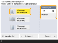 1 | Appuyez sur <Effacement mode Original> et réglez <Format original>. ![]() Si le format affiché dans <Format original> est différent du format de l'original installé, appuyez sur <Modifier> pour sélectionner le bon format. |