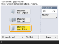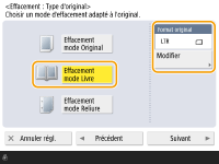 1 | Appuyez sur <Effacement mode Livre> et confirmez <Format original>. ![]() Si le format affiché dans <Format original> est différent du format du livre installé, appuyez sur <Modifier> pour sélectionner le bon format. |
