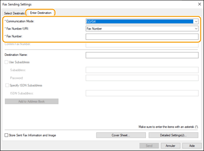 Cliquez sur l'onglet [Saisir la destination], et spécifiez le mode de communication et le numéro de fax que vous utilisez.
