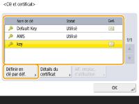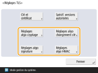 Si vous souhaitez utiliser une clé et un certificat que vous générez vous-même, générez-les avant d'effectuer la procédure ci-dessous. Génération de la clé et du certificat pour les communications réseau Si vous souhaitez utiliser une clé et un certificat acquis auprès d'une autorité de certification (CA), enregistrez la clé et le certificat avant d'effectuer la procédure ci-dessous. Enregistrement de la clé et du certificat Si vous réglez <Formater Méthode de cryptage en FIPS 140> sur <Oui>, vous pouvez mettre en conformité la méthode de cryptage de communication TLS avec la norme FIPS (Federal Information Processing Standards) 140 approuvée par l'administration américaine. <Formater Méthode de cryptage en FIPS 140> Si la version TLS est réglée sur <TLS 1.0> ou <TLS 1.1> et <Formater Méthode de cryptage en FIPS 140> est réglée sur <Oui>, la version TLS passe à <TLS 1.2>. Si <Formater Méthode de cryptage en FIPS 140> est réglé sur <Oui> et la version TLS est réglée sur <TLS 1.0> ou <TLS 1.1>, <Formater Méthode de cryptage en FIPS 140> passe à <Non>. Si l'option <Formater Méthode de cryptage en FIPS 140> est réglée sur <Oui>, une erreur se produira lorsque vous essayez de spécifier un certificat pour TLS qui utilise un algorithme non reconnu par la norme FIPS (inférieur à RSA 2048 bits). Une erreur de communication se produira si vous réglez <Formater Méthode de cryptage en FIPS 140> sur <Oui>, et effectuez un envoi à un tiers qui ne prend pas en charge les algorithmes de cryptage reconnus par la norme FIPS. Si <Formater Méthode de cryptage en FIPS 140> est réglé sur <Oui>, <CHACHA20-POLY1305>, <3DES-CBC> et <X25519> passe sur <Non>. Si <CHACHA20-POLY1305>, <3DES-CBC> ou <X25519> est réglé sur <Oui>, <Formater Méthode de cryptage en FIPS 140> passe sur <Non>. |