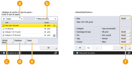 Lorsque l'on mémorise les réglages du type de papier personnalisé, veiller à modifier son nom. Il est impossible de modifier les réglages des types de papier par défaut enregistrés sur la machine. |