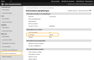 ![]() | De nouveaux microprogrammes sont périodiquement publiés afin d'ajouter des fonctions ou de corriger les défauts des fonctions existantes. Si un nouveau microprogramme est disponible, suivez la procédure ci-après afin de le mettre à jour sur l'appareil. Vous devez disposer des privilèges d'administrateur pour mettre à jour le microprogramme. |