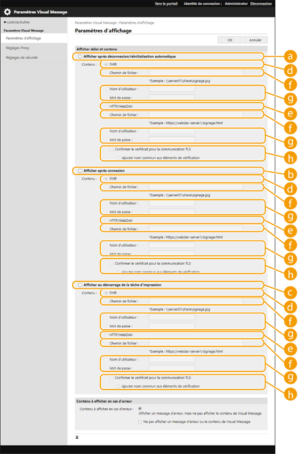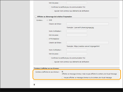 Spécifiez les réglages Proxy dans la fonction Visual Message en accord avec les réglages sélectionnés dans <Réglages Proxy>. Si un Proxy est réglé, il peut arriver que le contenu spécifié ne s'affiche pas. Dans ce cas, définissez une adresse particulière de sorte que le serveur proxy ne soit pas utilisé.