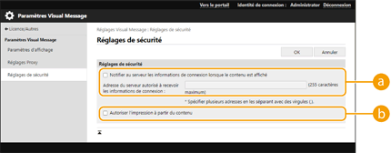 Cochez cette case pour publier les informations utilisateur (nom d'utilisateur et nom de domaine) sur le serveur Web lorsque l'utilisateur affiche le Visual Message, et saisissez le mot de passe du serveur Web.