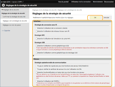 Les réglages de l'appareil relatifs à la sécurité de l'information peuvent être appliqués et gérés par lot. Il est recommandé que l'administrateur de la sécurité de l'information en charge de la gestion de votre politique de sécurité applique la politique de sécurité de l'appareil conformément à la politique de votre entreprise. Pour configurer la politique de sécurité, connectez-vous à l'interface utilisateur distante avec les privilèges d'administrateur.