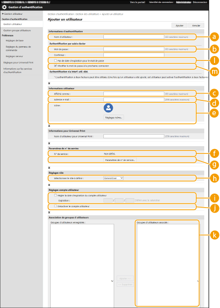 dc | Non | 0 à 32 caractères | Caractères de contrôle | - (N/A) | N'est pas modifiable. Il sera automatiquement affecté aux utilisateurs suivants. Utilisateurs enregistrés selon le serveur d'authentification |