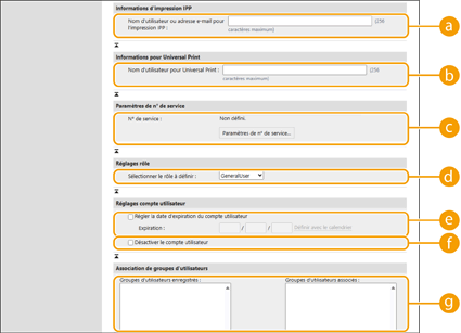 Cochez la case pour que le mot de passe de l'utilisateur à enregistrer n'ait pas de date d'expiration. Vous pouvez faire ce réglage si [Durée de validité du mot de passe] est réglé sur [Non] dans [Stratégie de réglages du mot de passe] dans [Authentification] dans [Réglages de la stratégie de sécurité].
