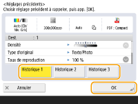 ![]() | Vous pouvez rappeler les destinations spécifiées dans le passé. Leurs paramètres de numérisation comme la densité sont aussi rappelés en même temps. |