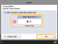 ![]() | Vous pouvez numériser des originaux à l'avance et les envoyer/sauvegarder à une heure spécifique. |