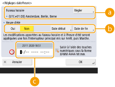 <Heure d'été>Pour définir l'heure d'été, appuyez sur <Oui> puis spécifiez la date et l'heure pour <Date début> et <Date de fin>. Pour définir la date, indiquez le jour de la semaine et la semaine du mois.