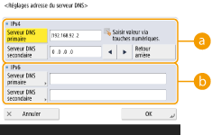 2 | Définissez les paramètres nécessaires. Selon votre environnement, saisissez l'adresse IP du serveur DNS. ![]() Pour plus d'informations sur les paramètres, contactez votre fournisseur ou votre administrateur réseau. Vous pouvez également consulter les paramètres de l'ordinateur. Affichage des informations de connexion réseau de l'ordinateur ![]() <IPv4>Appuyez sur <Serveur DNS primaire>, et saisissez l'adresse IPv4 du serveur DNS. Si un serveur DNS secondaire a été déployé, saisissez son adresse IP. Si vous ne configurez aucun serveur DNS secondaire, saisissez « 0.0.0.0 ». <IPv6>Appuyez sur <Serveur DNS primaire>, et saisissez l'adresse IPv6 du serveur DNS. Sont à proscrire les adresses commençant par « ff » (adresse multidiffusion), les adresses constituées uniquement de « 0 » ou les adresses Link-Local. Si un serveur DNS secondaire a été déployé, saisissez son adresse IP. Sont à proscrire les adresses commençant par "ff" (adresse multidiffusion), les adresses constituées uniquement de "0" ou les adresses Link-Local. Ce champ peut rester vierge. |