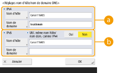 2 | Définissez les paramètres nécessaires. ![]() <IPv4>Appuyez sur <Nom d'hôte>, et saisissez le nom d'hôte de l'appareil afin de l'enregistrer sur le serveur DNS en utilisant des caractères alphanumériques. Appuyez sur <Nom de domaine>, puis saisissez le nom du domaine auquel appartient l'appareil, en utilisant des caractères alphanumériques (exemple : "exemple.fr"). <IPv6>Pour spécifier le même nom d'hôte et nom de domaine que ceux d'IPv4, appuyez sur <Oui> dans <Util. même nom hôte/nom dom. comme IPv4>. Pour spécifier un nom d'hôte et nom de domaine différents de ceux d'IPv4, appuyez sur <Non>. Pour spécifier un nom d'hôte différent de celui d'IPv4, appuyez sur <Nom d'hôte> et saisissez le nom d'hôte de l'appareil à enregistrer sur le serveur DNS en utilisant des caractères alphanumériques. Pour définir un nom de domaine autre qu'IPv4, appuyez sur <Nom de domaine>, puis saisissez le nom du domaine auquel appartient l'appareil, en utilisant des caractères alphanumériques (exemple : "exemple.fr"). ![]() Si vous définissez <Utiliser DHCPv6> sur <Oui> pour les réglages d'adresse avec état (Configuration d'une adresse IPv6), le nom de domaine configuré manuellement est écrasé. Si vous définissez <Util. même nom hôte/nom dom. comme IPv4> sur <Oui>, le nom de domaine qui est extrait du serveur DHCPv6 est utilisé. |