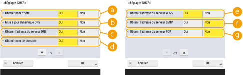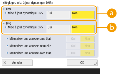 2 | Définissez les paramètres nécessaires. ![]() <IPv4>Pour mettre automatiquement les informations à jour lorsque la correspondance entre le nom d'hôte et l'adresse IP est modifiée, par exemple dans un environnement DHCP, appuyez sur <Oui> dans <Mise à jour dynamique DNS>. <IPv6>Pour mettre automatiquement les informations à jour lorsque la correspondance entre le nom d'hôte et l'adresse IP est modifiée, par exemple dans un environnement DHCP, appuyez sur <Oui> dans <Mise à jour dynamique DNS>. Sélectionnez <Oui> pour l'adresse que vous souhaitez enregistrer pour le serveur DNS dans <Mémoriser une adresse sans état>/<Mémoriser une adresse manuelle>/<Mémoriser une adresse avec état>. Veuillez noter que la mise à jour automatique ne peut pas s'exécuter si toutes ces options sont réglées sur <Non>. |