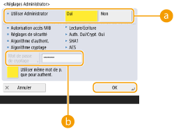 3 | Spécifiez les réglages nécessaires et appuyez sur <OK>. ![]() <Utiliser Administrator>Si vous utilisez Administrator, sélectionnez <Oui>. <Mot de passe de cryptage>Si vous utilisez un mot de passe différent de celui utilisé pour l'authentification, décochez la case pour <Utiliser même mot de p. que pour authent.>, appuyez sur <Mot de passe de cryptage>, et saisissez le mot de passe. ![]() Si "Administrator" est désactivé, vous ne pouvez pas régler <Régl. Administrator> (le réglage de <Utiliser Administrator> est défini sur <Non>). |