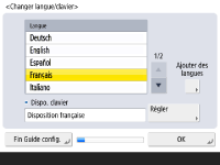 Sélectionnez la langue à afficher sur les écrans. Selon la langue choisie, il est possible de changer l'organisation du clavier affiché pour saisir les caractères. ![]() ![]() Sélectionnez la langue et appuyez sur <OK>. Pour changer l'organisation du clavier, appuyez sur <Régler>, sélectionnez l'organisation du clavier et appuyez sur <OK>. Si vous devez fréquemment la langue d'affichage, il est plus pratique d'afficher le bouton pour changer la langue. Changement de la langue d'affichage | |