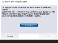 Pour configurer les réglages nécessitant les privilèges d'administrateur, connectez-vous en vous identifiant. ![]() ![]() Appuyez sur <Connexion>, et saisissez le nom et le mot de passe d'un utilisateur avec les privilèges d'administrateur. Le mot de passe par défaut pour l'administrateur est "Administrateur" et le mot de passe par défaut, "7654321". Appuyez à nouveau sur <Connexion>, puis sur <OK>. Si vous saisissez le mot de passe par défaut d'usine, un écran vous invitant à changer le mot de passe s'affiche. Vous pouvez le changer immédiatement ou plus tard. Connexion en tant qu'administrateur Vous pouvez ignorer les réglages nécessitant les privilèges d'administrateur et passer à l'étape suivante en appuyant sur <Ignorer>. Dans ce cas, passez à l'étape 10. | |
