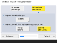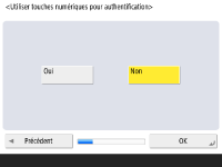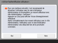 Pour améliorer la sécurité de l'appareil, utilisez-le dans le cadre d'un système appliquant l'authentification utilisateur. ![]() Cet appareil est configuré pour utiliser l'authentification utilisateur comme service de connexion. Pour davantage d'informations, voir Configuration des réglages de la gestion de l'authentification personnelle. ![]() Sélectionnez <Oui> pour <Utiliser l'authentification utilisateur>, appuyez sur <Oui> pour la méthode de connexion et appuyez sur <Suivant>. Si vous n'utilisez pas l'authentification utilisateur, appuyez sur <Non> pour <Utiliser l'authentification utilisateur>, appuyez sur <OK>, et procédez à l'étape 5. ![]() Spécifiez les réglages suivants en l'absence d'administrateurs autres que l'utilisateur "Administrateur" enregistrés sur l'appareil. ![]() Pour renforcer la sécurité de l'appareil en désactivant l'utilisateur "Administrateur" et en enregistrant un nouvel administrateur, appuyez sur <Oui>. Dans Mémoriser administrateur, entrez <Nom d'utilisateur> et <Mot de passe>, puis appuyez sur <OK>. Spécifiez <Adresse e-mail>, <N° de service> et <Nom d'affichage> selon les besoins. Pour en savoir plus, consultez la section Enregistrement des informations des utilisateurs dans le dispositif local. L'utilisateur "Administrateur" sera désactivé à la prochaine connexion. Pour une utilisation comme "Administrateur", appuyez sur <Non>. ![]() ![]() Sélectionnez le délai d'affichage de l'écran de connexion. Si vous sélectionnez <Afficher fonct. sélectionnée>, appuyez sur <Fonctions>, sélectionnez la fonction pour afficher l'écran de connexion et appuyez sur <OK>. De même, sélectionnez les éléments de réglage sur l'écran <Réglages/Enregistrement> pour afficher l'écran de connexion. Si vous sélectionnez <Non> pour l'<Authentification clavier>, appuyez sur <OK>. Passez à l'étape 5. Si vous sélectionnez <Oui> pour l'<Authentification clavier>, appuyez sur <Suivant>. ![]() ![]() Pour utiliser l'authentification via la saisie de clé numérique uniquement sur l'écran de connexion, appuyez sur <Oui> et appuyez sur <OK>. | |