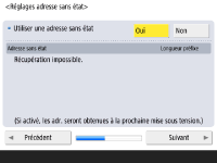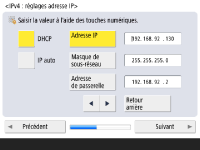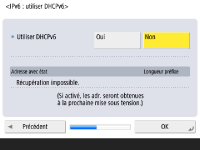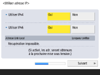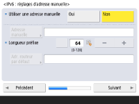 Spécifiez les réglages pour la connexion au réseau. ![]() ![]() Appuyez sur <Oui> pour <Utiliser IPv4> ou <Utiliser IPv6>, puis appuyez sur <Suivant>. Vous pouvez également utiliser IPv4 et IPv6 en même temps. Si vous appuyez sur <Non> pour <Utiliser IPv4> et <Utiliser IPv6>, et que vous appuyez sur <OK>, passez les réglages de réseau et passez à l'étape 9. ![]() Si vous appuyez sur <Oui> pour <Utiliser IPv4>, spécifiez les réglages suivants. ![]() Pour obtenir l'adresse IP automatiquement, appuyez sur <DHCP> ou <IP auto>, et appuyez sur <Suivant> ou <OK>. Pour spécifier l'adresse IP manuellement, effacez la sélection pour <DHCP> ou <IP auto>, appuyez sur <Adresse IP>, <Masque de sous-réseau>, et <Adresse de passerelle> pour saisir chaque valeur, puis appuyez sur <Suivant> ou <OK>. Pour information concernant les réglages pour les adresses IPV4, voir la section Configuration d'une adresse IPv4. ![]() Si vous appuyez sur <Oui> pour <Utiliser IPv6>, spécifiez les réglages suivants. ![]() Appuyez sur <Oui> pour utiliser l'adresse sans état ou <Non> dans le cas contraire, puis appuyez sur <Suivant>. Pour information concernant les adresses IPV6, voir la section Configuration d'une adresse IPv6. ![]() Après avoir spécifié l'adresse sans état, spécifiez les réglages suivants. ![]() Appuyez sur <Oui> pour utiliser l'adresse manuelle ou <Non> dans le cas contraire, puis appuyez sur <Suivant>. Pour utiliser l'adresse manuelle, appuyez sur <Adresse manuelle>, <Longueur préfixe> et <Adr. routeur par défaut> pour saisir chaque valeur. ![]() Après avoir spécifié l'adresse manuelle, spécifiez les réglages suivants. ![]() Appuyez sur <Oui> pour utiliser DHCPv6 ou <Non> dans le cas contraire, puis appuyez sur <OK>. | |