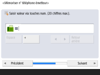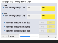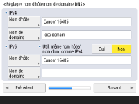 Spécifiez l'adresse du serveur DNS, le nom d'hôte et le nom de domaine DNS. ![]() ![]() Appuyez sur <Serveur DNS primaire> et <Serveur DNS secondaire>, saisissez l'adresse IPV4/IPv6 pour le serveur DNS, puis appuyez sur <Suivant>. Pour toute information sur la configuration de l'adresse d'un serveur DNS, voir la section Définition des paramètres DNS. ![]() ![]() Appuyez sur <Nom d'hôte> pour saisir le nom de l'appareil (nom d'hôte). Appuyez sur <Nom de domaine> pour saisir le nom du domaine auquel l'appareil appartient, puis appuyez sur <Suivant>. Si la configuration d'IPv4 et d'IPv6 est la même, appuyez sur <Oui> pour <Util. même nom hôte/nom dom. comme IPv4>. ![]() ![]() Pour mettre à jour automatiquement à l'aide des réglages de mise à jour de façon dynamique, appuyez sur <Oui> pour <Mise à jour dynamique DNS>, puis appuyez sur <OK>. Si vous réglez <Mise à jour dynamique DNS> pour <IPv6> sur <Oui>, sélectionnez <Oui> pour les éléments à enregistrer automatiquement. | |