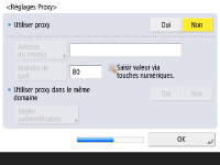 Spécifiez les réglages nécessaires pour utiliser le serveur proxy. ![]() ![]() Pour utiliser le serveur proxy, appuyez sur <Oui>, appuyez sur <Adresse du serveur> et <Numéro de port> pour saisir chaque valeur, puis appuyez sur <OK>. Si vous réglez <Utiliser proxy dans le même domaine> sur <Oui>, appuyez sur <Régler authentification> pour spécifier les réglages d'authentification pour le serveur proxy. Pour toute information sur les réglages du serveur proxy, voir Réglage d'un proxy. | |
