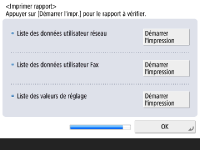 Vous pouvez imprimer la liste des utilisateurs du réseau, la liste des données des utilisateurs de la télécopie et la liste des valeurs ajustées. ![]() ![]() Appuyez sur <Démarrer l'impression> pour le rapport à imprimer. Une fois l'impression terminée, ou si vous ne voulez pas imprimer une liste, appuyez sur <OK>. | |