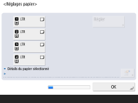 Vérifiez que le papier chargé dans les cassettes est correctement spécifié. ![]() ![]() Si les formats sont corrects, appuyez sur <OK>. Pour toute information sur l'écran et les instructions pour changer les réglages, voir la section Spécification du format et du type de papier dans la cassette. S'il ne s'agit pas d'une session administrateur, passez à l'étape 10. | |