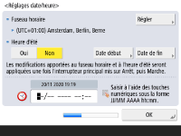 Indiquez la date et l'heure de l'appareil. ![]() ![]() Indiquez la date et l'heure, puis appuyez sur <OK>. Spécifiez le <Fuseau horaire> et l'<Heure d'été>. Pour davantage d'informations, voir Réglage de la date et de l'heure. | |
