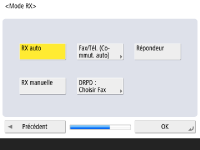 Spécifiez les réglages nécessaires pour utiliser la fonction de télécopie. ![]() Si votre machine n’a pas de fonction télécopie, passez à l’étape 10. Sélectionnez la région/le pays si l'écran de sélection s'affiche et appuyez sur <Suivant>. ![]() ![]() Saisissez le numéro de fax et appuyez sur <Suivant>. Pour toute information sur les réglages de télécopie, voir Réglages de la ligne de fax. ![]() ![]() Appuyez sur <Régler>, saisissez le nom d'utilisateur et appuyez sur <Suivant>. ![]() ![]() Sélectionnez le type de ligne et appuyez sur <Suivant>. ![]() ![]() Appuyez sur <RX auto> lorsque vous utilisez la fonction de fax ou sur <Fax/Tél. (Commut. auto)> lorsqu'un téléphone ou un combiné est connecté à la machine et appuyez sur <OK>. | |