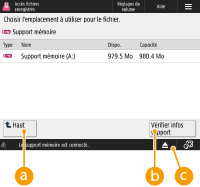 <Vérifier infos support>Vous permet de vérifier le numéro de série et l'espace libre du support de mémoire.