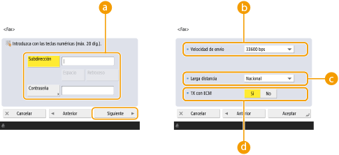 2 | Pulse <Establecer detalles> y especifique las opciones según sea necesario. ![]() <Subdirección>/<Contraseña>Especifíquelo al enviar o recibir documentos para incrementar la seguridad, asociando una subdirección y una contraseña a todas sus transacciones de fax. Operaciones básicas para enviar faxes <Velocidad de envío>En función del equipo de fax del destinatario o del estado de la línea, puede producirse un error de transmisión debido a la velocidad de la transmisión. Si el error se produce con frecuencia, reduzca el valor de esta opción. <Larga distancia>Si se producen errores de transmisión al realizar llamadas a otros países, seleccione <Internacional (1)>. Si el error persiste, cambie la configuración a <Internacional (2)> o <Internacional (3)>. <TX con ECM>Seleccione <Sí> para corregir los errores de la imagen. Seleccione <No> si el equipo de fax del destinatario no admite el Modo de corrección de errores (ECM). ![]() Para enviar faxes mediante ECM, es necesario configurar <Opciones de fax> <TX con ECM> en <Sí>.![]() Aunque hay elementos que puede establecer en la configuración del fax (Pantalla de funciones básicas de fax), resulta más práctico hacerlo aquí si desea cambiar las condiciones de envío para cada destino. Configure <Ajuste auto velocidad de comunicación al usar VoIP> en <Sí> para enviar y recibir faxes con mayor precisión cuando la línea o la otra parte sean propensos a los errores. Si configura la opción en <Sí>, la velocidad de comunicación se limitará a 14.400 bps o menos, con lo que se reducirán los errores. |