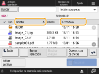 Cuando haya varios trabajos/archivos en una lista, podrá pulsar <Nombre> o <Fecha/hora> para clasificar la lista de elementos. Cuando se muestre , los elementos aparecerán en orden ascendente, y cuando se muestre , estos aparecerán en orden descendente.