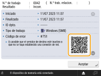 Cuando se muestre un código QR en una ventana de Detalles de un registro de errores, el escaneado del código QR con un dispositivo móvil, como puede ser un smartphone o una tableta, le permitirá acceder a una página de la Guía de usuario de este equipo, que le dice cómo gestionar el error.