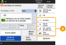 El número de opciones incluidas en la pantalla Funciones básicas y la ubicación donde aparecen varía según las funciones. No se mostrará un botón de acceso directo si <No asignado> se establece como acceso directo. El límite del número de accesos directos para <Opciones> que puede registrar es el siguiente. Copia: 5 Fax: 4 Leer y enviar: 2 |