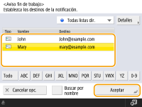 Hay que especificar el destino del correo electrónico de notificación en la Libreta de direcciones. Registre el destino deseado de antemano. Registro de destinos en la libreta de direcciones