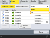 Pulse (Stop) cuando haya varios trabajos de envío que mostrar en la pantalla para seleccionar el trabajo de envío que desea cancelar. Si no se muestra el trabajo de envío que desea cancelar, pulse <Compruebe otros trab.> para mostrar <Trabajos de envío>. Seleccione el trabajo que desea cancelar y pulse <Cancelar>.