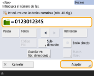 Comprobar el número total de destinos especificadosEn la parte superior derecha de la pantalla se muestra el número total de destinos especificados. Esto le permite confirmar antes de proceder al envío que el número de destinos es correcto. ![]() Para enviar con la información del remitentePuede enviar con el nombre y el número de fax del remitente. <ID de terminal TX> Para consultar los estados de los documentos enviadosEn la pantalla <Monitor estado>, puede consultar los estados de los documentos enviados. En esta pantalla puede volver a enviar faxes o cancelar el envío tras consultar los estados. Comprobación del estado y el registro de los documentos enviados y recibidos Cuando <Mostrar notificación cuando se acepta el trabajo> está establecido en <Sí>, la pantalla <Monitor estado> puede mostrarse desde la siguiente pantalla mostrada tras la recepción de un trabajo enviado.<Mostrar notificación cuando se acepta el trabajo> ![]() Si se produce un error de transmisión porque la línea del destinatario comunicaEl equipo vuelve a marcar automáticamente tras un cierto período de tiempo. Puede cambiar la configuración relativa a cuántas veces vuelve a marcar el equipo y al intervalo entre marcaciones. <Remarcación auto> Para imprimir el informe de los resultados del envíoEn la pantalla de funciones básicas de fax, al pulsar <Opciones> <Informe result. de TX>, podrá configurar que se imprima automáticamente el informe con la lista de resultados del envío.Para establecer esto para cada trabajo en <Opciones>, es necesario seleccionar <Sólo en caso de error> o <No> en <Informe result. de TX> y, a continuación, configurar <Permitir impresión desde opciones> en <Sí>. Cuando las fotos de la imagen enviada son demasiado oscuras o tienen colores claros en el fondo de color, los originales no pueden eliminarseLa calidad de la imagen enviada puede mejorarse si se cumplen las siguientes condiciones y ajustes. Tipo de trabajo: Fax (Envío desde memoria) o Leer y Enviar (Fax/I-fax) <Selección color>: <Blanco y negro> (Leer y Enviar) <Tipo de original>: <Texto> <Densidad> <Densidad del fondo>: <Auto><Resolución>: 200 ppp x 400 ppp, 300 ppp x 300 ppp*, 400 ppp x 400 ppp o 600 ppp x 600 ppp* * Puede establecerse para Leer y enviar <Priorizar vel./calidad de imagen para lectura en B/N> Trabajos de envío por fax/I-fax: <Priorizar calidad> (<Priorizar vel./calidad de imagen para lectura en B/N>) |