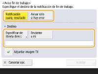 Para seleccionar el destino del que se desean realizar notificaciones <Libreta de direcciones>, antes hay que registrarlo. Registro de destinos en la libreta de direcciones Para seleccionar <Enviarme a mí> como destino para la notificación, es necesario que registre previamente su dirección de correo electrónico en la información del usuario y que inicie sesión con la gestión de autenticación personal. Registro de la información de usuario en el dispositivo local |