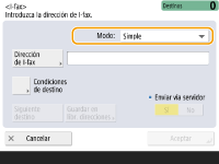 Si desea configurar el equipo para poder consultar el resultado de envío de un documento en la pantalla <Monitor estado>, seleccione <Lleno>. Si no, seleccione <Simple>. Tenga en cuenta que el destinatario también tiene que admitir el modo de transmisión para poder comprobar el resultado del envío. En función del equipo del destinatario, no se permite enviar un I-fax a menos que seleccione <Simple>.