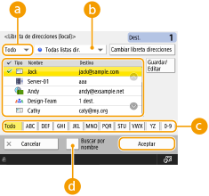 Lista desplegable de listas de direccionesLe permite ver un grupo concreto de destinos. Si inicia una sesión en el equipo con la gestión de autenticación personal, al seleccionar <Lista dir. person.>, aparece su Libreta de direcciones personal.