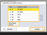 Pulse <Especificar por nombre servicio> para utilizar nombres de servicio al especificar los puertos a los que se aplica IPSec. Seleccione el servicio en la lista, pulse <Activ./Desac. servicio> para activarlo (<Sí>) y pulse <Aceptar>.