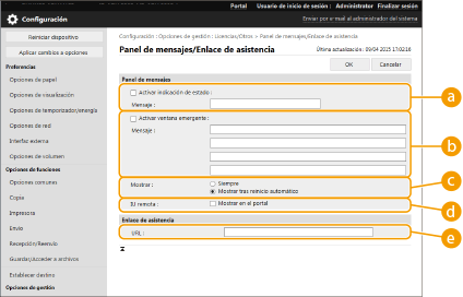 Para mostrar el mensaje en una ventana emergente en la pantalla táctil, seleccione la casilla de verificación e introduzca el mensaje en [Mensaje]. Utilice esta opción para mostrar mensajes más importantes.