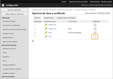 Haga clic en [Gestión del dispositivo]  [Opciones de clave y certificado].