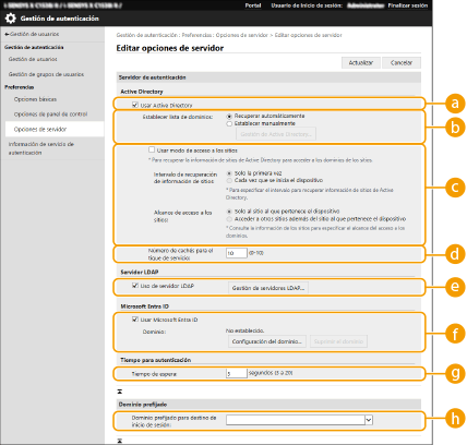 Especifique el límite de tiempo para intentar conectarse al servidor de autenticación y el tiempo límite de espera para obtener respuesta. Si está habilitado [Guardar información de autenticación para usuarios de inicio de sesión] y no puede iniciar sesión en el límite de tiempo aquí especificado, se intentará iniciar sesión utilizando la información de autenticación guardada en la caché.